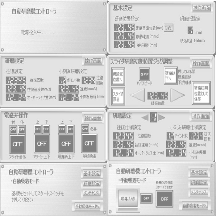 PCLとスライダーを利用した自動研磨装置のPLCプログラミング。画面には小型液晶タッチパネルをつかって操作パネルをつくりました。メーカ様の製造ラインで使用されています。